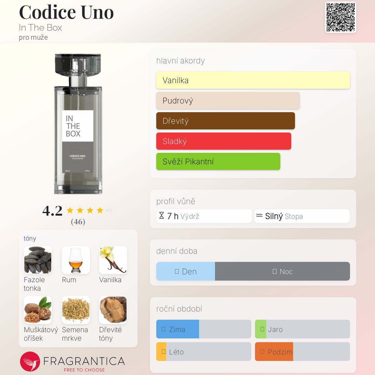 Codice Uno podle In The Box je Orientální Spicy vůně pro muže. Codice Uno byl/a uveden/a v roce 2020. Vrchní tóny jsou Zelená mandarinka a Jablko; střední tóny jsouRum, Muškátový oříšek, Semena mrkve a Pomerančový květ ; základní tóny jsou Fazole tonka, Vanilka a Dřevité tóny.