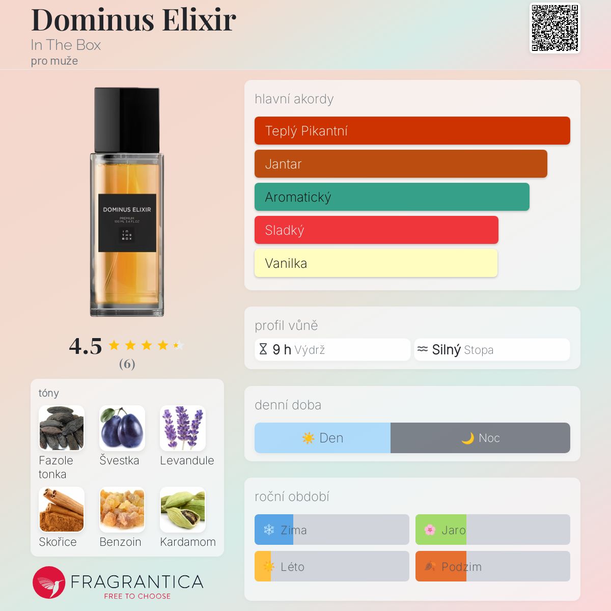 Dominus Elixir podle In The Box je Orientální Spicy vůně pro muže. Toto je nová vůně. Dominus Elixir byl/a uveden/a v roce 2025. Vrchní tóny jsou Švestka, Skořice, Kardamom a Bergamot; střední tóny jsouLevandule, Pelyněk a Davana ; základní tóny jsou Fazole tonka, Benzoin, Pačuli, Labdanum a Ambrette (přírodní pižmo).