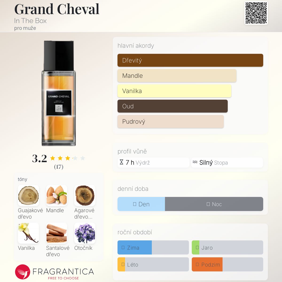 Grand Cheval podle In The Box je Orientální Woody vůně pro muže. Grand Cheval byl/a uveden/a v roce 2023. Vrchní tóny jsou Otočník, Kardamom, Růžový pepř a Bergamot; střední tóny jsouHořká mandle, Levandule, Pelargónie a Jasmín ; základní tóny jsou Guajakové dřevo, Agarové dřevo (oud), Vanilka, Santalové dřevo a Jantar (ambra).
