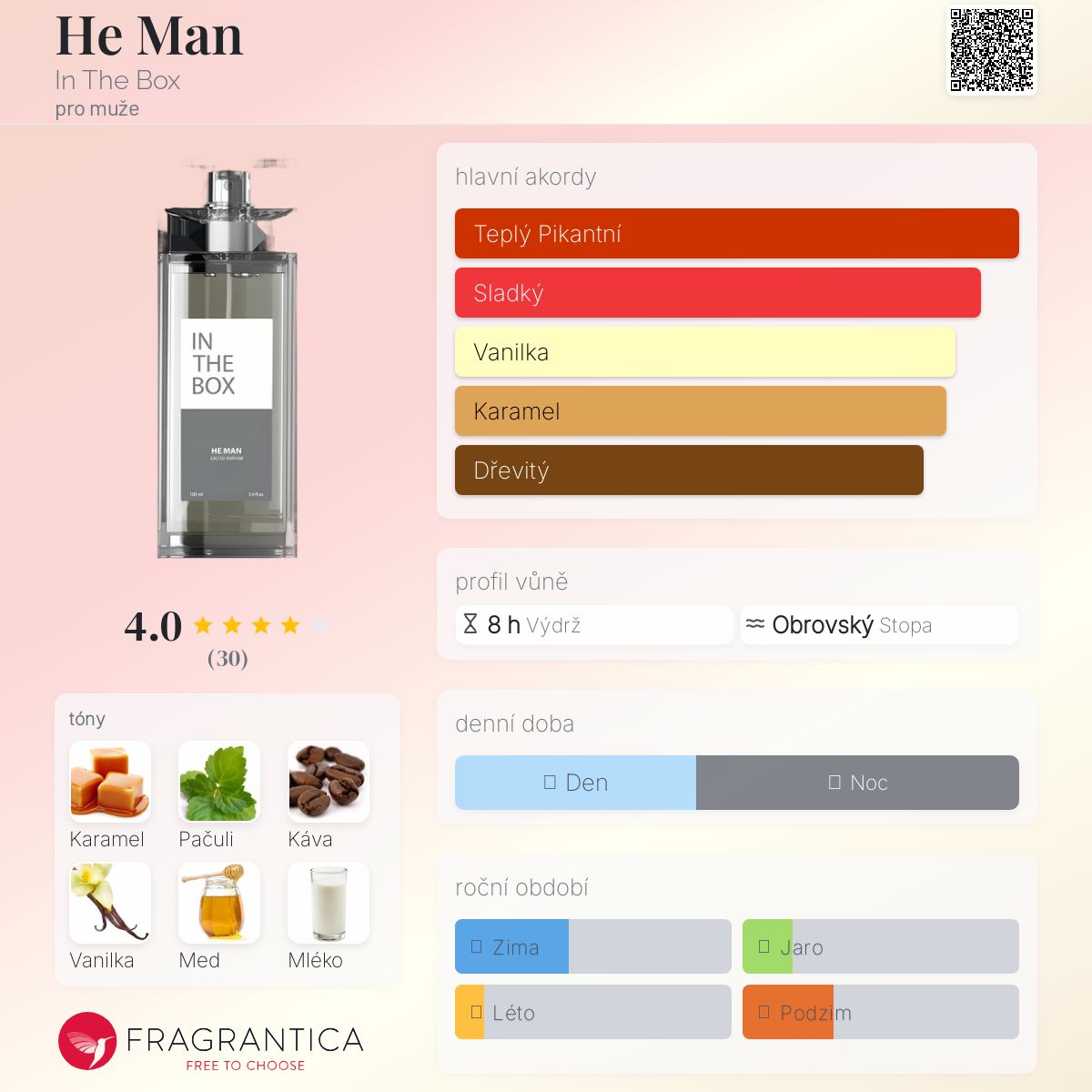 He Man podle In The Box je Orientální Woody vůně pro muže. He Man byl/a uveden/a v roce 2018. Vrchní tóny jsou Levandule, Pikantní máta, Ovocné tóny, Koriandr, Zelené tóny, Bergamot a Koření; střední tóny jsouKaramel, Pačuli, Med, Mléko, Cedr, Jasmín a Konvalinka ; základní tóny jsou Pačuli, Káva, Vanilka, Fazole tonka, Benzoin, Santalové dřevo, Jantar (ambra) a Pižmo.