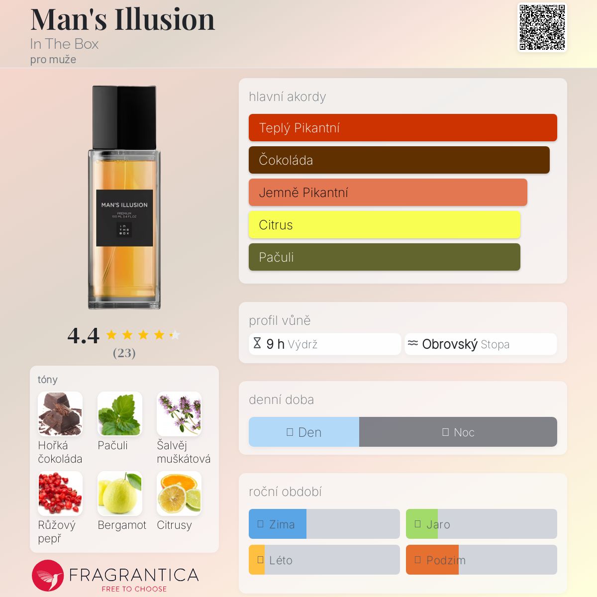 Man's Illusion podle In The Box je Orientální vůně pro muže. Toto je nová vůně. Man's Illusion byl/a uveden/a v roce 2025. Vrchní tóny jsou Růžový pepř, Bergamot a Citrusy; střední tóny jsouHořká čokoláda a Šalvěj muškátová ; základní tón je Pačuli.
