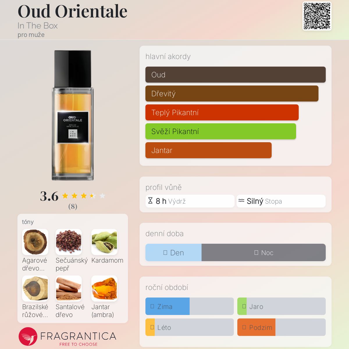 Oud Orientale podle In The Box je Orientální Woody vůně pro muže. Toto je nová vůně. Oud Orientale byl/a uveden/a v roce 2025. Vrchní tóny jsou Sečuánský pepř, Kardamom a Brazilské růžové dřevo; střední tóny jsouSantalové dřevo a Vetiver ; základní tóny jsou Agarové dřevo (oud), Jantar (ambra), Fazole tonka a Vanilka.