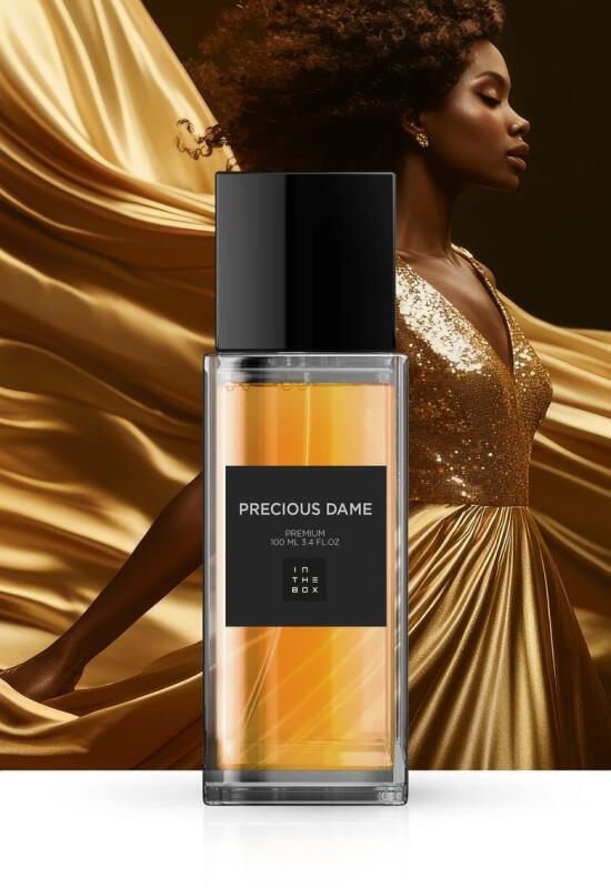 Precious Dame podle In The Box je Floral Fruity vůně pro ženy. Toto je nová vůně. Precious Dame byl/a uveden/a v roce 2025. Vrchní tóny jsou Hořký pomeranč, Maliny a Neroli; střední tóny jsouPomerančový květ, Jasmín Sambac a Gardénie ; základní tóny jsou Pačuli, Jantar (ambra) a Med.