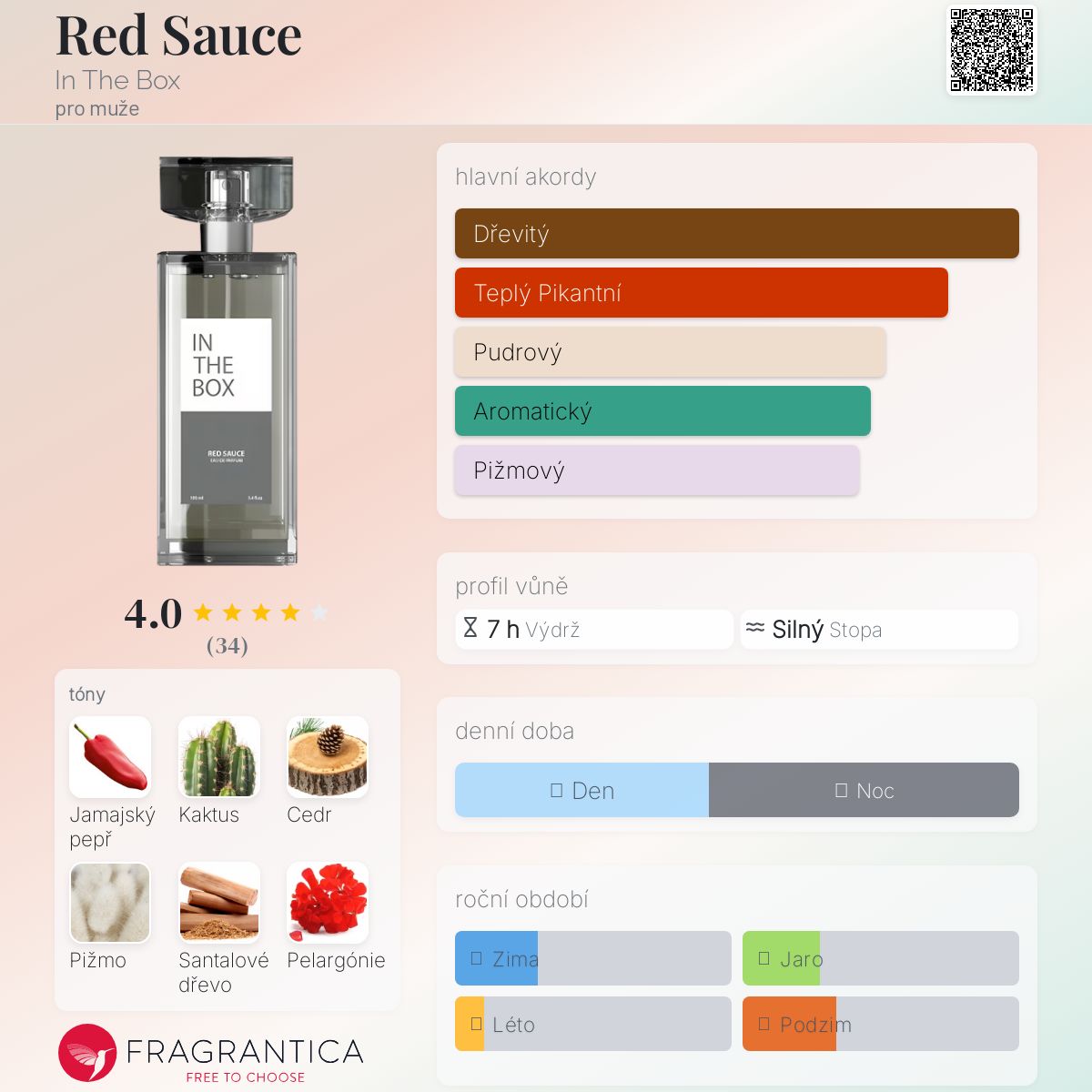 Red Sauce podle In The Box je Orientální Fougere vůně pro muže. Red Sauce byl/a uveden/a v roce 2020. Vrchní tóny jsou Kaktus, Estragon a Pomeranč; střední tóny jsouČervená chilli paprička, Cedr a Pelargónie ; základní tóny jsou Cedr, Pižmo a Santalové dřevo.