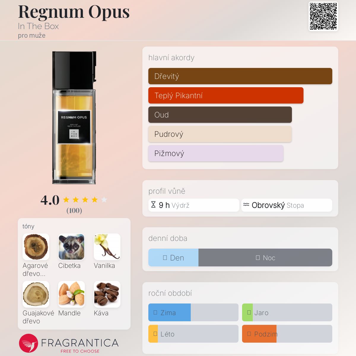 Regnum Opus podle In The Box je Orientální vůně pro muže. Regnum Opus byl/a uveden/a v roce 2022. Vrchní tóny jsou Mandle, Mandarinka, Bergamot a Vodnaté tóny; střední tóny jsouCibetka, Kardamom, Růže, Pelargónie, Gardénie a Leknín ; základní tóny jsou Agarové dřevo (oud), Vanilka, Guajakové dřevo, Káva, Santalové dřevo, Jantar (ambra), Dubový mech, Pačuli a Růžový pepř.