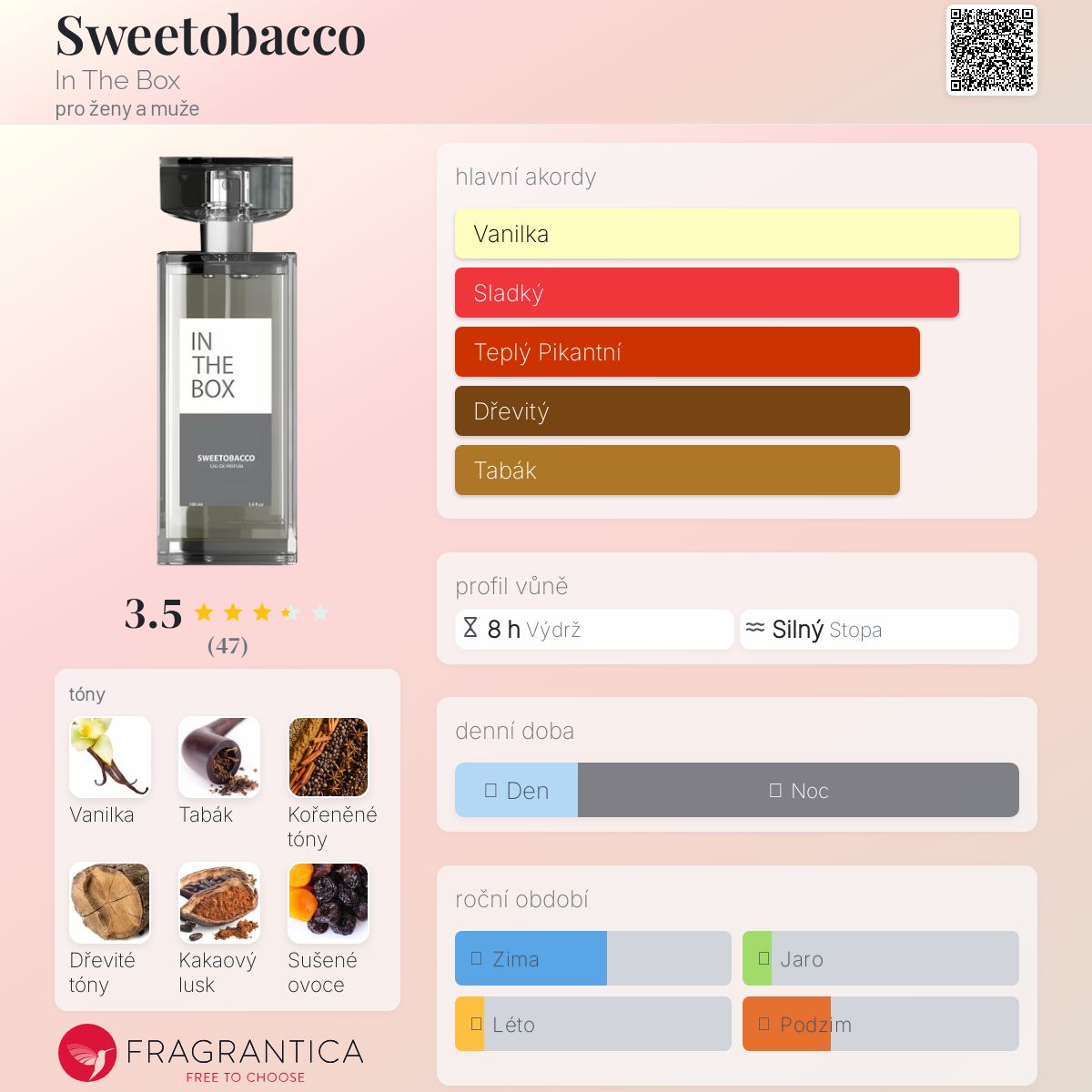 Sweetobacco podle In The Box je Orientální Vanilla vůně pro ženy a muže. Sweetobacco byl/a uveden/a v roce 2019. Vrchní tóny jsou Tabákový list a Kořeněné tóny; střední tóny jsouVanilka, Kakao, Tabákový květ a Fazole tonka ; základní tóny jsou Dřevité tóny a Sušené ovoce.
