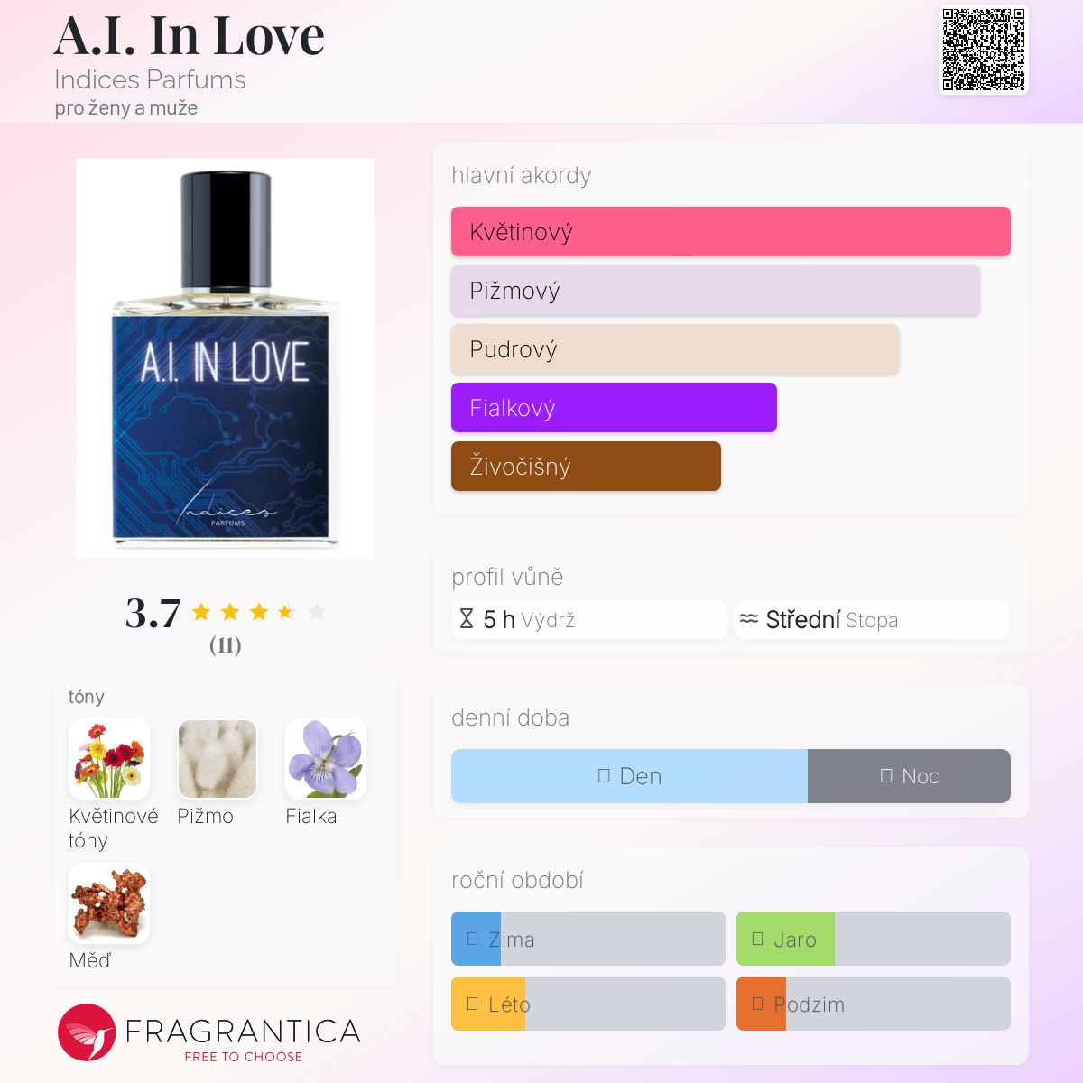 A.I. In Love podle Indices Parfums je Floral vůně pro ženy a muže. A.I. In Love byl/a uveden/a v roce 2021. "Nosem" za touto vůní je Cécile Doan.