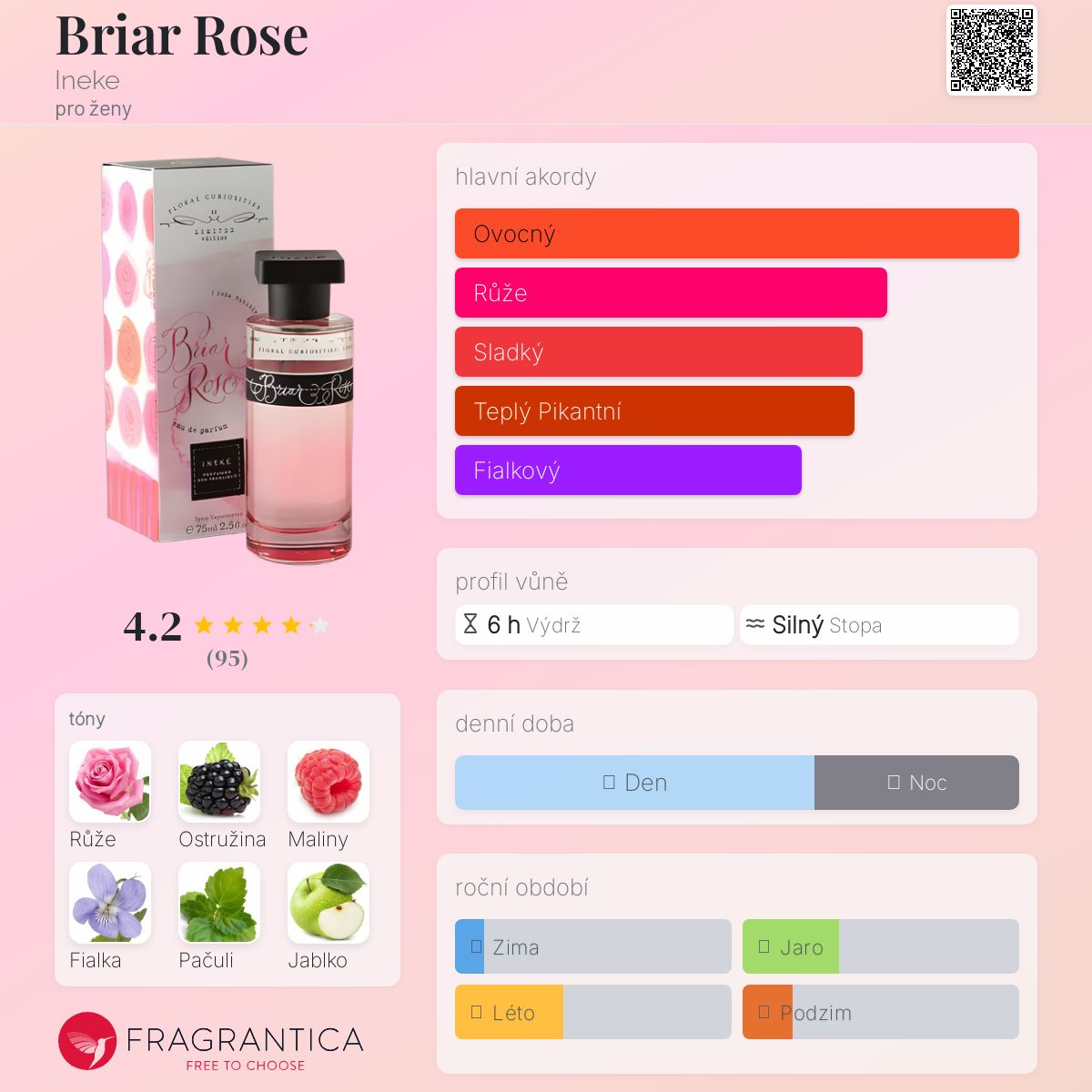 Briar Rose podle Ineke je Floral Fruity vůně pro ženy. Briar Rose byl/a uveden/a v roce 2011. "Nosem" za touto vůní je Ineke Ruhland. Vrchní tóny jsou Ostružina, Maliny a Zelené jablko; střední tóny jsouRůže, Fialka, Skořice, Hřebíček a Kardamom ; základní tóny jsou Pačuli, Vanilka, Kakaový lusk a Hořká mandle.