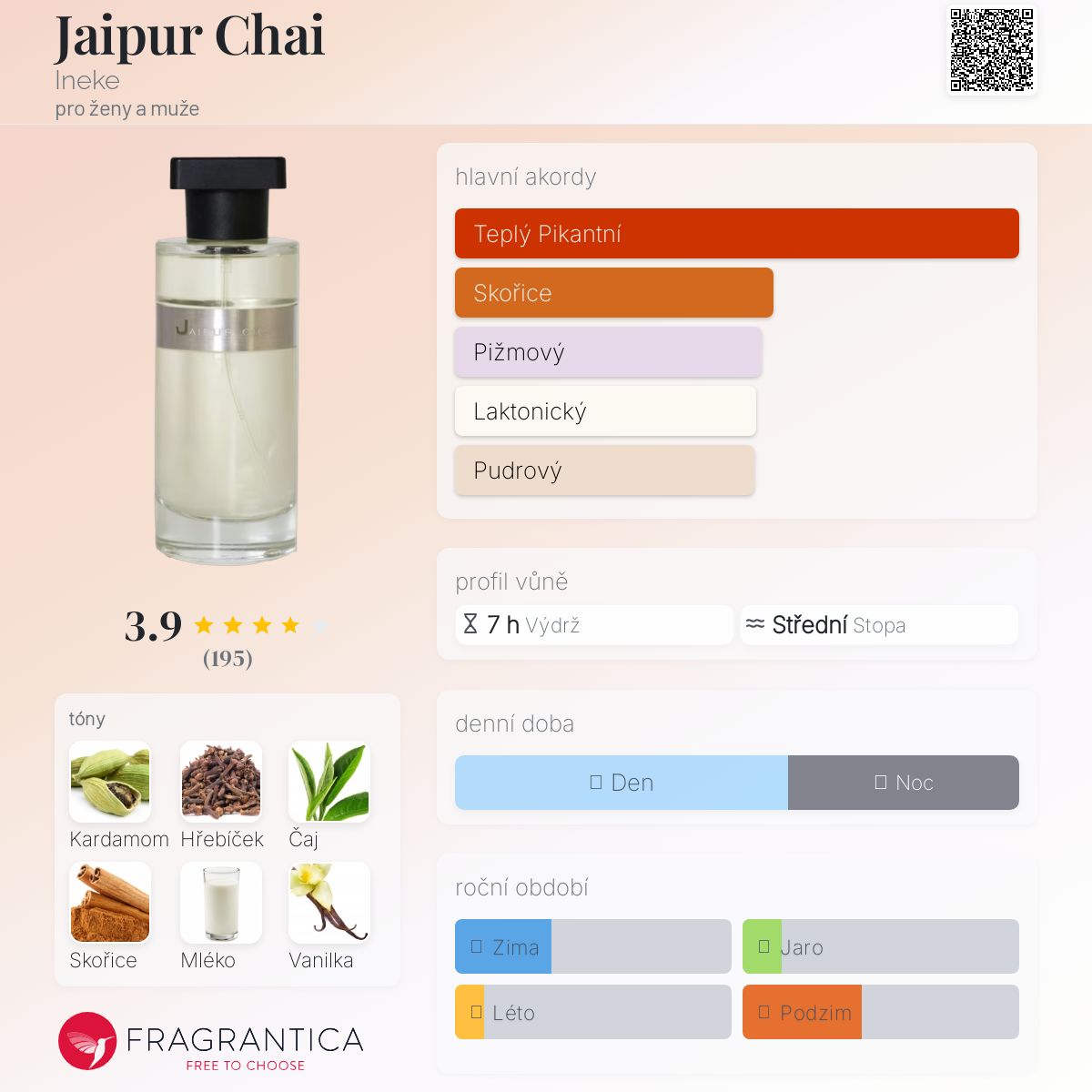 Jaipur Chai podle Ineke je vůně pro ženy a muže. Jaipur Chai byl/a uveden/a v roce 2019. "Nosem" za touto vůní je Ineke Ruhland. Vrchní tóny jsou Kardamom, Hřebíček, Černý čaj a Skořice; střední tóny jsouRůže, Cedr a Guajakové dřevo ; základní tóny jsou Mléko, Vanilka, Semiš a Pižmo.