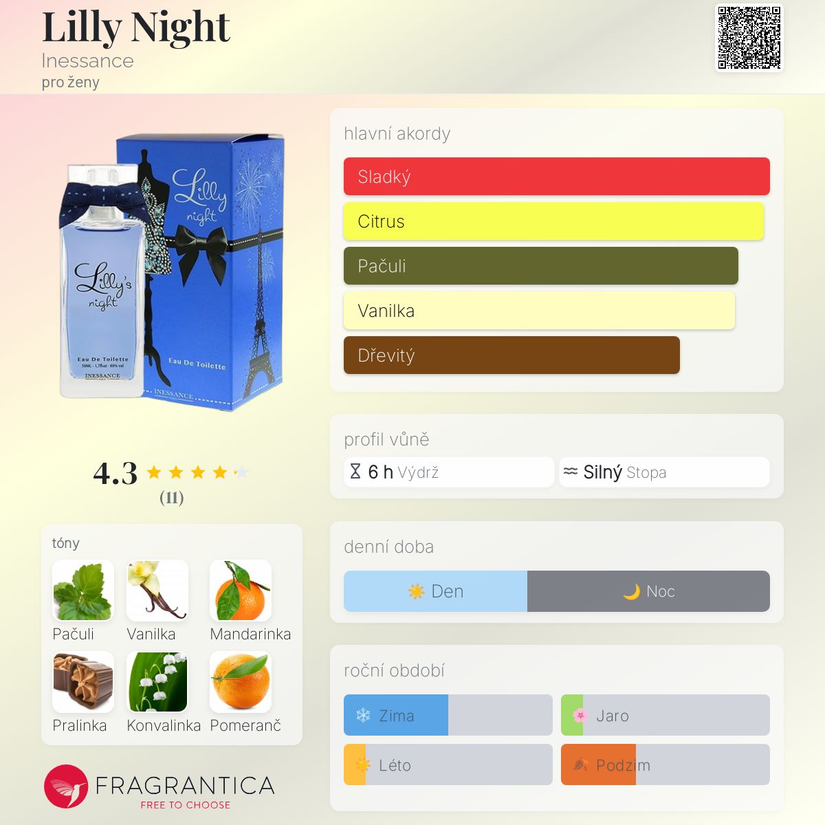 Lilly Night podle Inessance je Orientální Vanilla vůně pro ženy. Lilly Night byl/a uveden/a v roce 2015. Vrchní tóny jsou Mandarinka, Pomeranč, Bergamot a Černý rybíz; střední tóny jsouPačuli, Konvalinka, Švestka a Fazole tonka ; základní tóny jsou Vanilka, Pralinka, Jantar (ambra), Pižmo a Santalové dřevo.