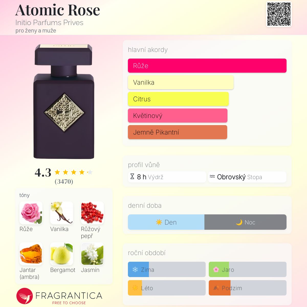 Atomic Rose podle Initio Parfums Prives je Orientální Floral vůně pro ženy a muže. Atomic Rose byl/a uveden/a v roce 2019. Vrchní tóny jsou Růžový pepř a Bergamot; střední tóny jsouBulharská růže, Turecká růže a Egyptský jasmín ; základní tóny jsou Madagaskarská vanilka a Jantar (ambra).