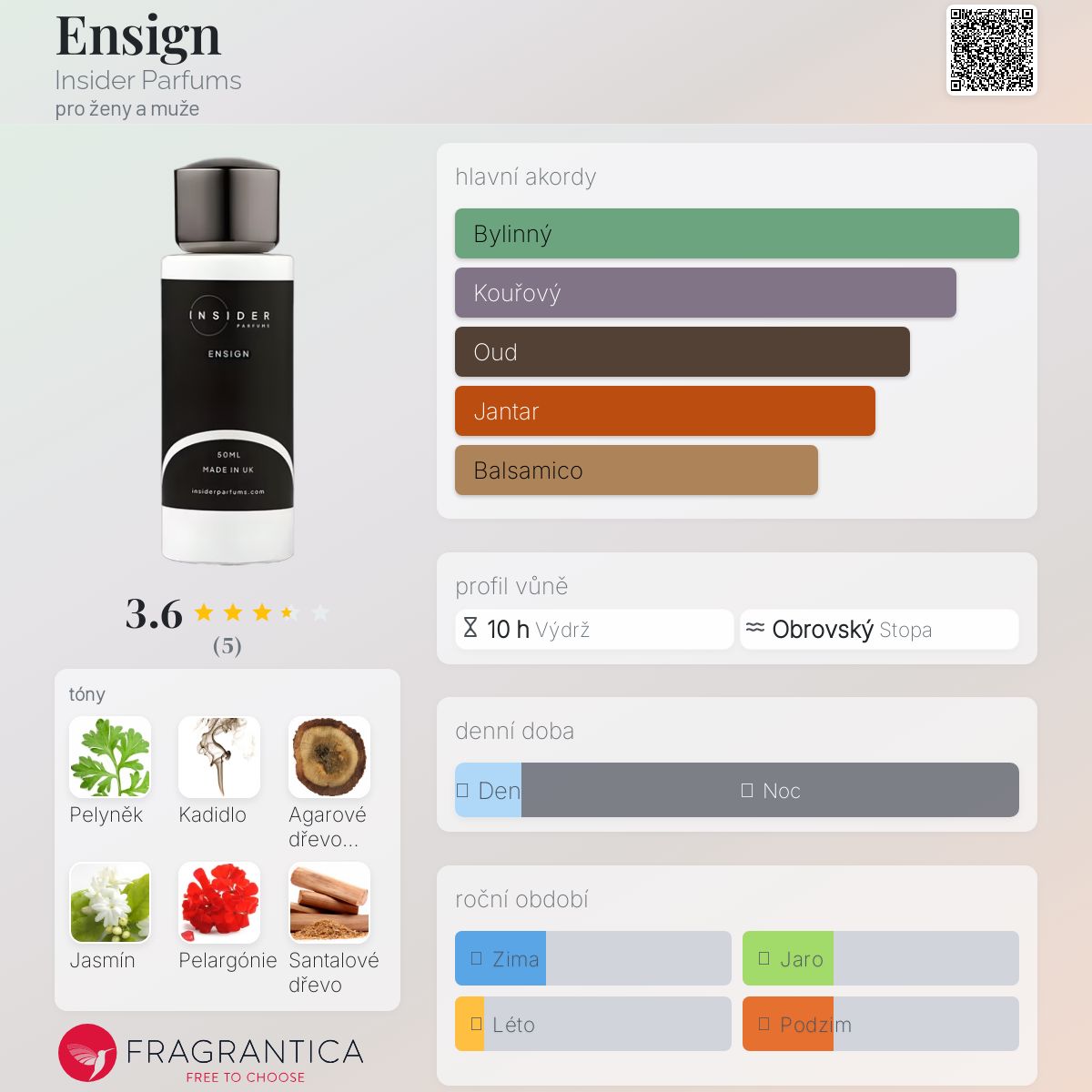 Ensign podle Insider Parfums je Woody Aromatic vůně pro ženy a muže. Toto je nová vůně. Ensign byl/a uveden/a v roce 2024. Vrchní tóny jsou Pelyněk, Jasmín, Bergamot a Šafrán; střední tóny jsouPelargónie, Bílá růže a Jantar (ambra) ; základní tóny jsou Kadidlo, Agarové dřevo (oud), Agarové dřevo (oud), Santalové dřevo, Pačuli, Vetiver a Cedr.