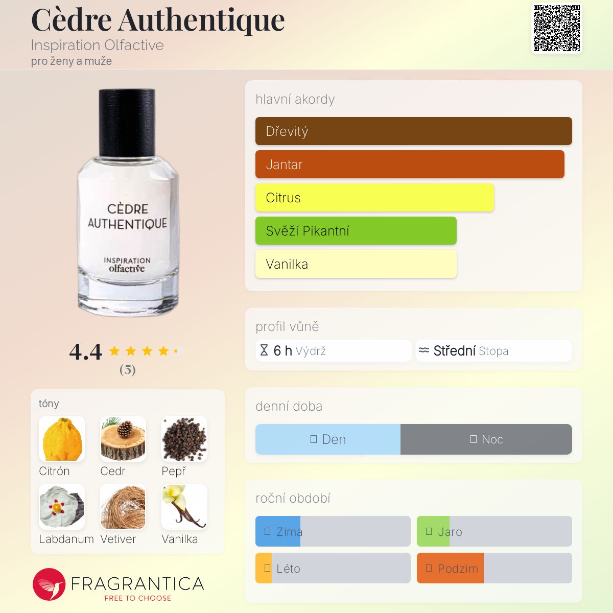 Cèdre Authentique podle Inspiration Olfactive je Woody vůně pro ženy a muže. Cèdre Authentique byl/a uveden/a v roce 2021. "Nosem" za touto vůní je Stéphanie Avinent Teisseire. Vrchní tóny jsou Citrón, Labdanum a Pepř; střední tóny jsouCedr a Kadidlo ; základní tóny jsou Vetiver, Vanilka a Ambra.