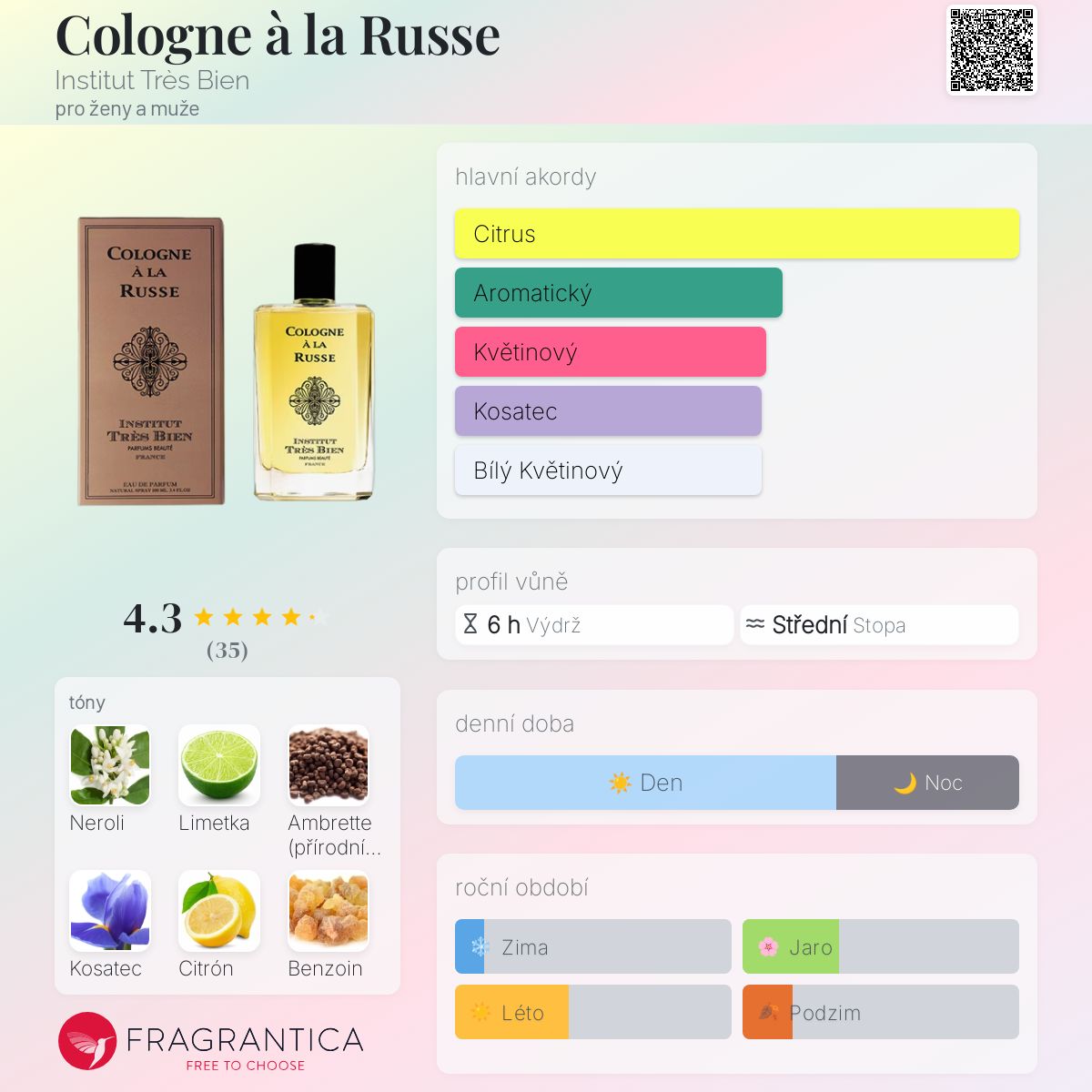 Cologne à la Russe podle Institut Très Bien je Leather vůně pro ženy a muže. Cologne à la Russe byl/a uveden/a v roce 2004. Vrchní tóny jsou Limetka, Citrón, Bergamot a Zedrát; střední tóny jsouSporýš, Pomerančový květ, Levandule a Rozmarýn ; základní tóny jsou Neroli, Ambrette (přírodní pižmo), Kosatec a Benzoin.