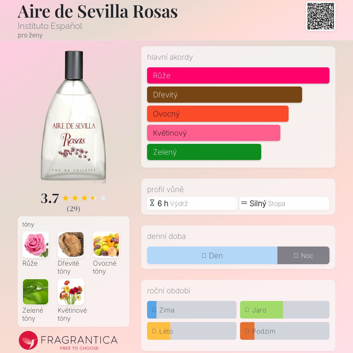 Aire de Sevilla Rosas podle Instituto Español je Floral Green vůně pro ženy. "Nosem" za touto vůní je Christian Plesch. Vrchní tóny jsou Ovocné tóny a Zelené tóny; střední tóny jsouRůže a Květinové tóny ; základní tón je Dřevité tóny.
