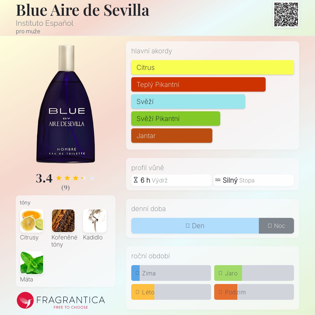 Blue Aire de Sevilla podle Instituto Español je Citrus Aromatic vůně pro muže. Vrchní tóny jsou Citrusy a Máta; střední tón jeKoření ; základní tón je Kadidlo.