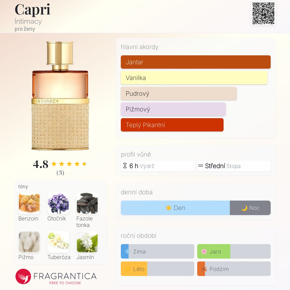 Capri podle Intimacy je Citrus Gourmand vůně pro ženy. Capri byl/a uveden/a v roce 2020. Vrchní tóny jsou Neroli, Davana, Petitgrain a Bergamot; střední tóny jsouOtočník, Tuberóza a Jasmín ; základní tóny jsou Benzoin, Fazole tonka, Pižmo a Pačuli.