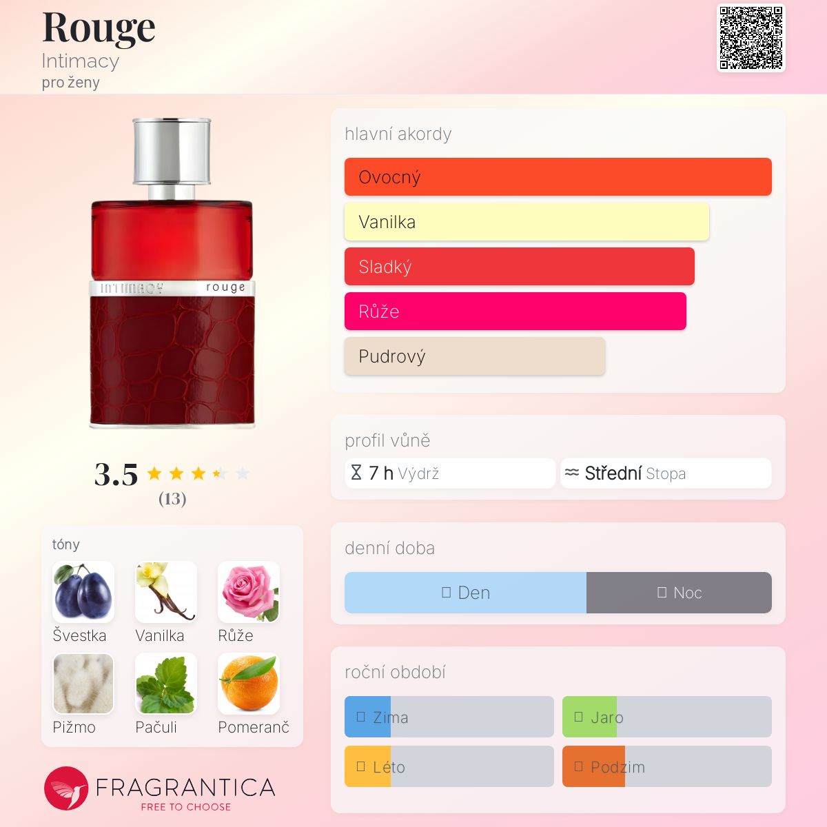 Rouge podle Intimacy je Woody Spicy vůně pro ženy. Rouge byl/a uveden/a v roce 2021. Vrchní tóny jsou Švestka a Pomeranč; střední tóny jsouRůže a Bílé pižmo ; základní tóny jsou Vanilka a Pačuli.