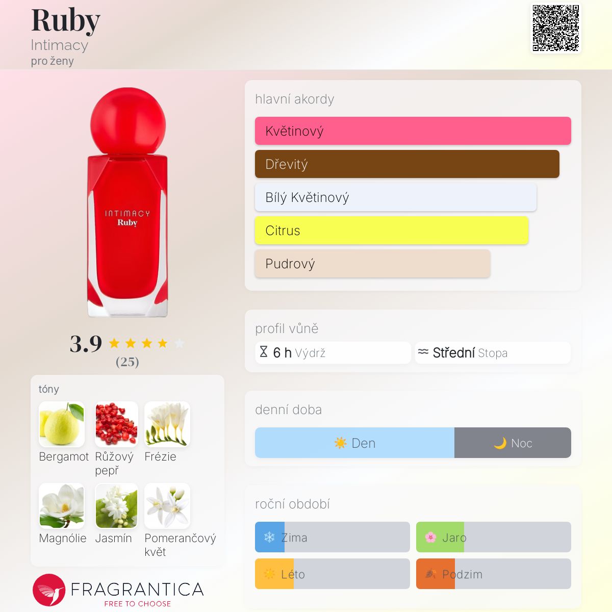 Ruby podle Intimacy je Floral vůně pro ženy. Ruby byl/a uveden/a v roce 2023. Vrchní tóny jsou Bergamot, Růžový pepř a Frézie; střední tóny jsouMagnólie, Jasmín, Pomerančový květ a Orris ; základní tóny jsou Santalové dřevo a Cedr.