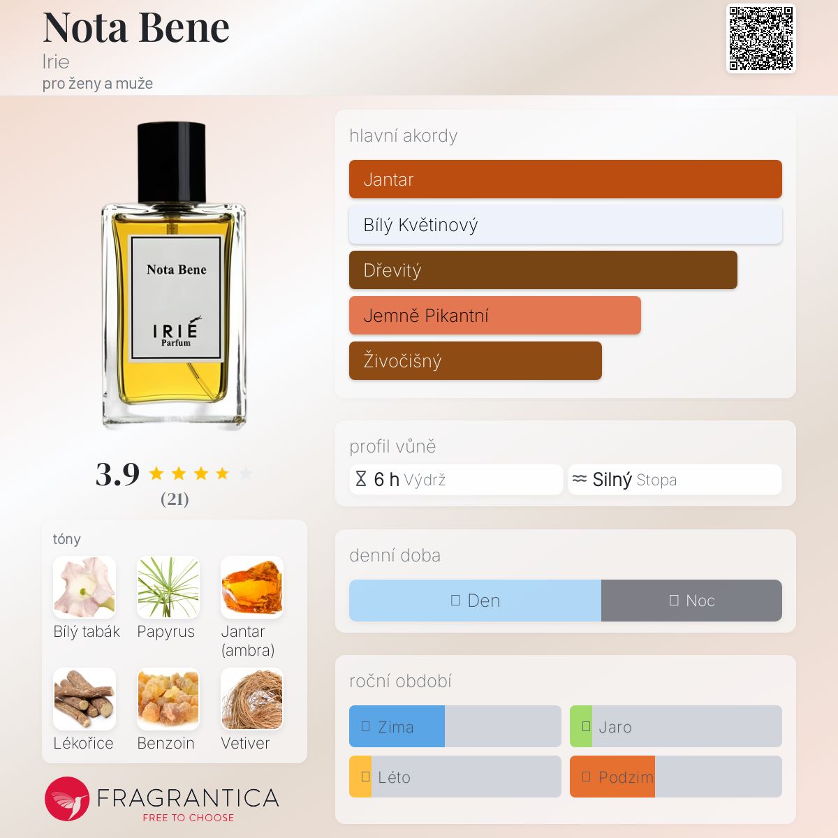 Nota Bene podle Irie je Woody Spicy vůně pro ženy a muže. Nota Bene byl/a uveden/a v roce 2014. "Nosem" za touto vůní je Julien Rasquinet. Vrchní tóny jsou Lékořice, Grapefruit a Růžový pepř; střední tóny jsouPapyrus, Benzoin a Bílý med ; základní tóny jsou Bulharský světlý tabák, Jantar (ambra) a Vetiver.