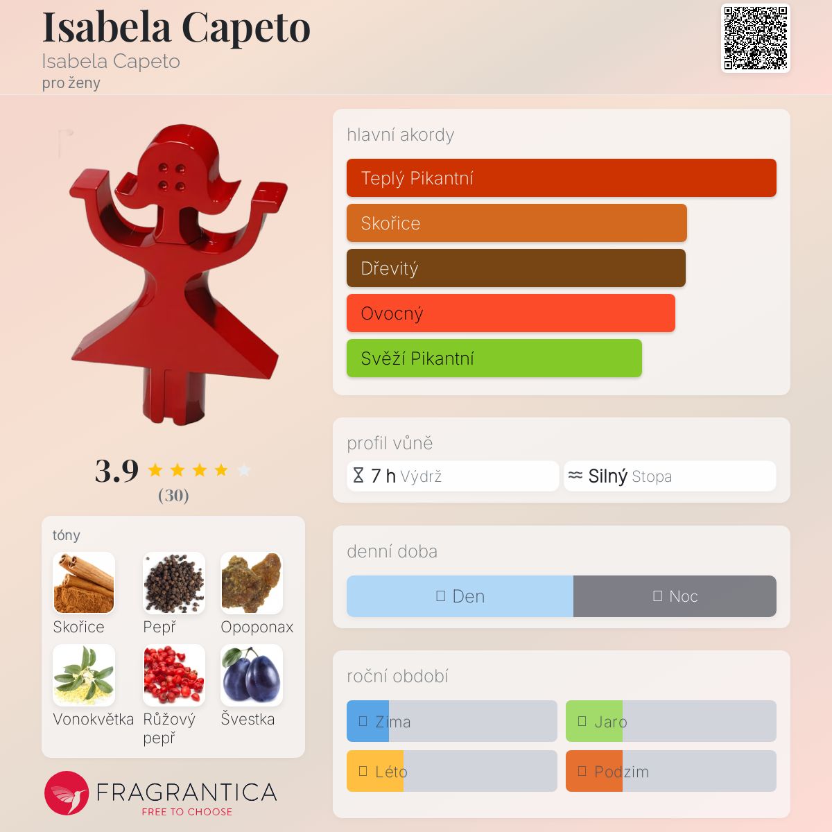 Isabela Capeto podle Isabela Capeto je Orientální Spicy vůně pro ženy. Isabela Capeto byl/a uveden/a v roce 2007. "Nosem" za touto vůní je Carmita Magalhaes.