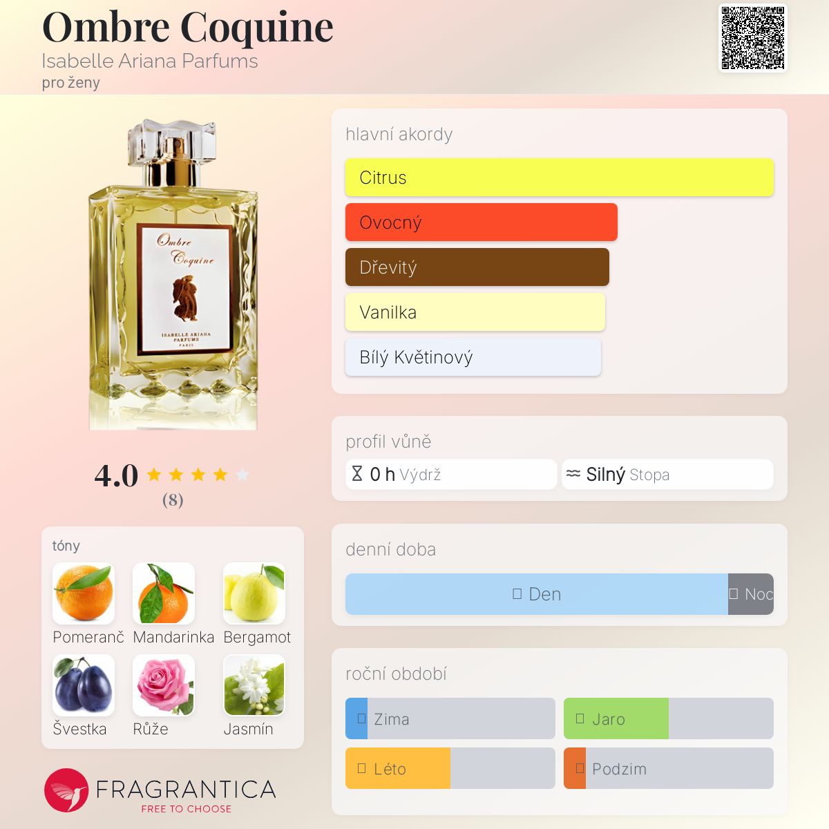 Ombre Coquine podle Isabelle Ariana Parfums je Floral Woody Musk vůně pro ženy. Ombre Coquine byl/a uveden/a v roce 2009. Vrchní tóny jsou Pomeranč, Mandarinka, Bergamot a Švestka mirabelka; střední tóny jsouRůže a Jasmín ; základní tóny jsou Cedr, Vanilka a Pižmo.