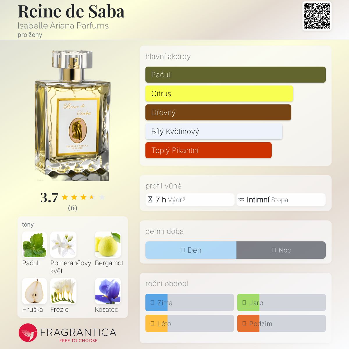 Reine de Saba podle Isabelle Ariana Parfums je Orientální Vanilla vůně pro ženy. Reine de Saba byl/a uveden/a v roce 2010. Vrchní tóny jsou Bergamot a Hruška; střední tóny jsouPomerančový květ, Frézie a Kosatec ; základní tóny jsou Pačuli a Karamel.