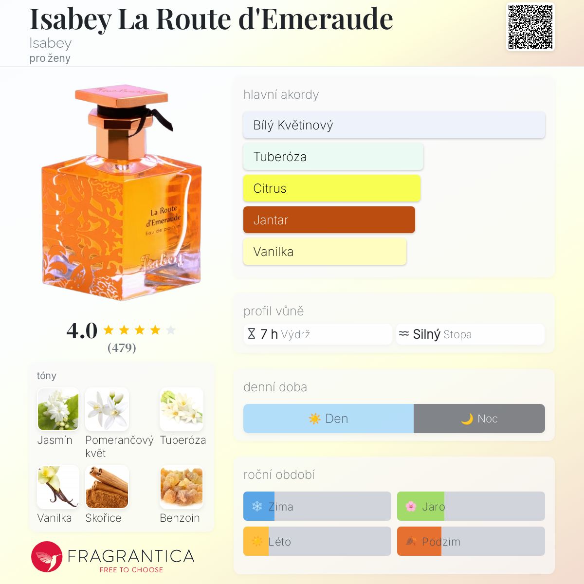 Isabey La Route d'Emeraude podle Isabey je Orientální Floral vůně pro ženy. Isabey La Route d'Emeraude byl/a uveden/a v roce 2012. Vrchní tóny jsou Skořice, Bergamot a Růžový olej; střední tóny jsouJasmín Sambac, Jasmín, Pomerančový květ a Tuberóza ; základní tóny jsou Vanilka, Benzoin, Jantar (ambra) a Pižmo.
