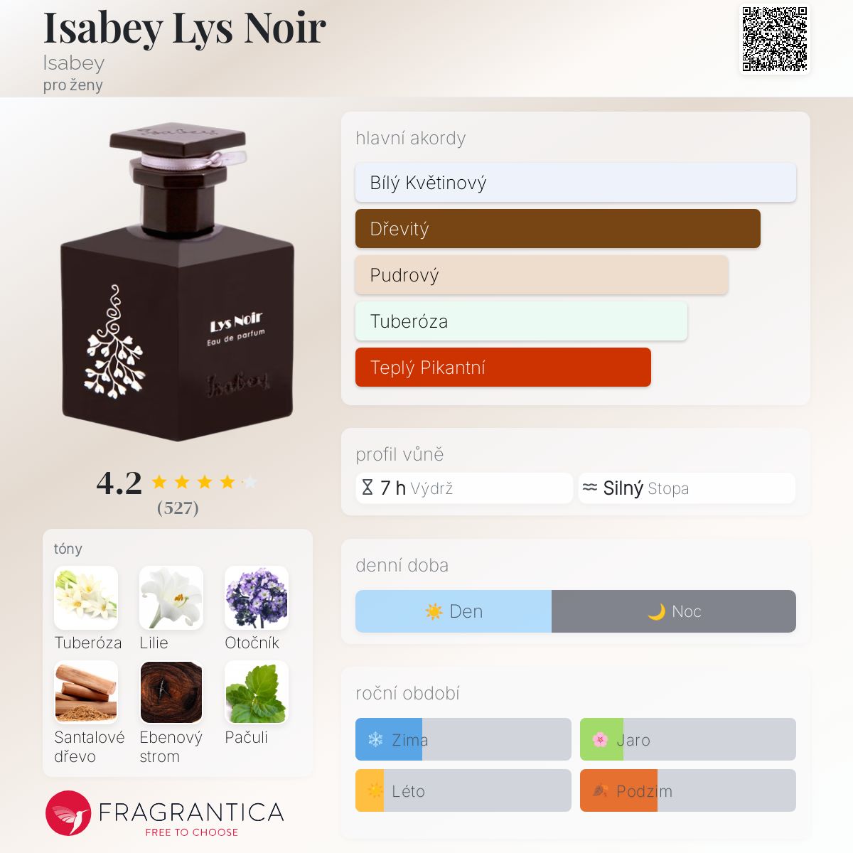 Isabey Lys Noir podle Isabey je Orientální Floral vůně pro ženy. Isabey Lys Noir byl/a uveden/a v roce 2014. "Nosem" za touto vůní je Jean Jacques. Vrchní tón je Pepř ; střední tóny jsouTuberóza, Lilie, Otočník a Narcis ; základní tóny jsou Santalové dřevo, Eben, Pačuli a Pižmo.