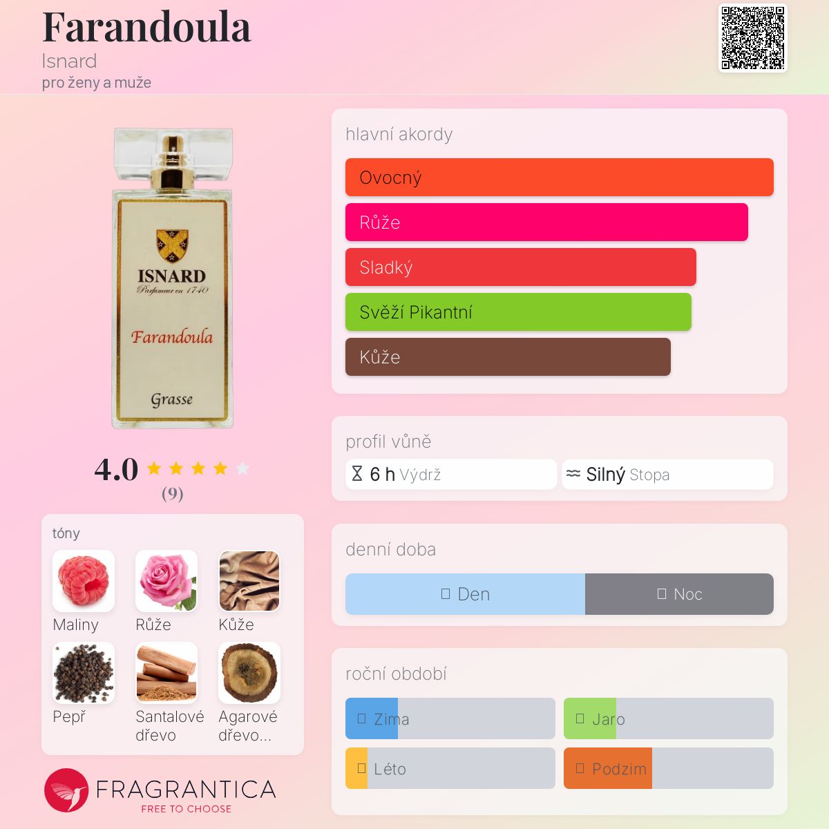 Farandoula podle Isnard je vůně pro ženy a muže. Vrchní tóny jsou Travní růže a Černý a růžový pepř; střední tóny jsouMaliny, Santalové dřevo, Kosatec a Pelargónie ; základní tóny jsou Kůže a Agarové dřevo (oud).