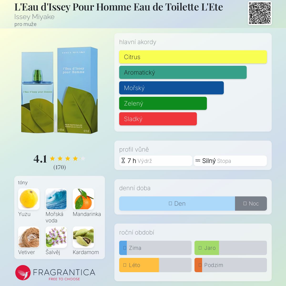 L'Eau d'Issey Pour Homme Eau de Toilette L'Ete podle Issey Miyake je Aromatic Aquatic vůně pro muže. L'Eau d'Issey Pour Homme Eau de Toilette L'Ete byl/a uveden/a v roce 2012. Vrchní tóny jsou Yuzu a Mandarinka; střední tóny jsouMořská voda, Šalvěj a Kardamom ; základní tóny jsou Vetiver a Jantar (ambra).