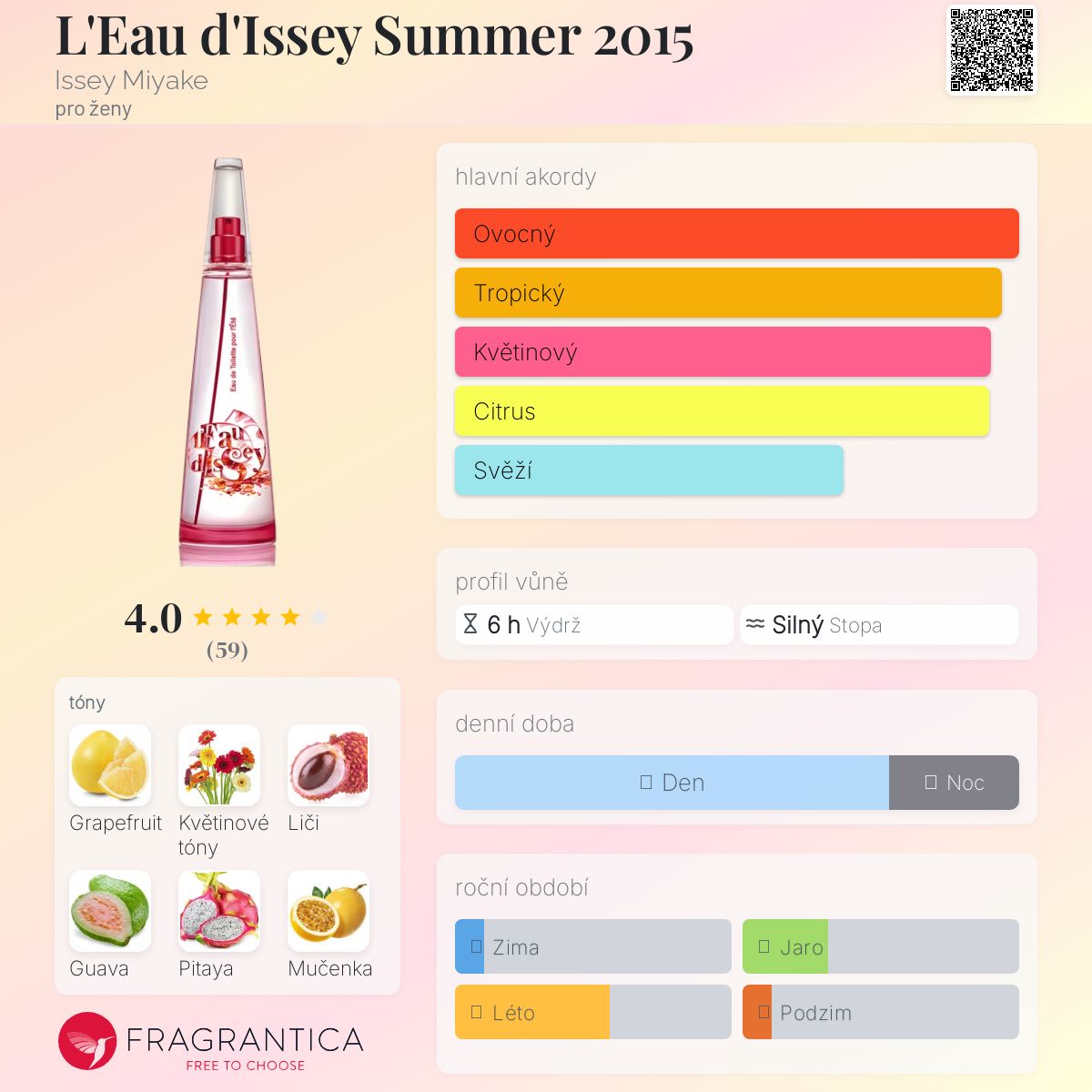 L'Eau d'Issey Summer 2015 podle Issey Miyake je Floral Fruity vůně pro ženy. L'Eau d'Issey Summer 2015 byl/a uveden/a v roce 2015. Vrchní tóny jsou Grapefruit a Liči; střední tóny jsouKvětinové tóny, Guava, Pitaya a Mučenka ; základní tón je Vanilka.