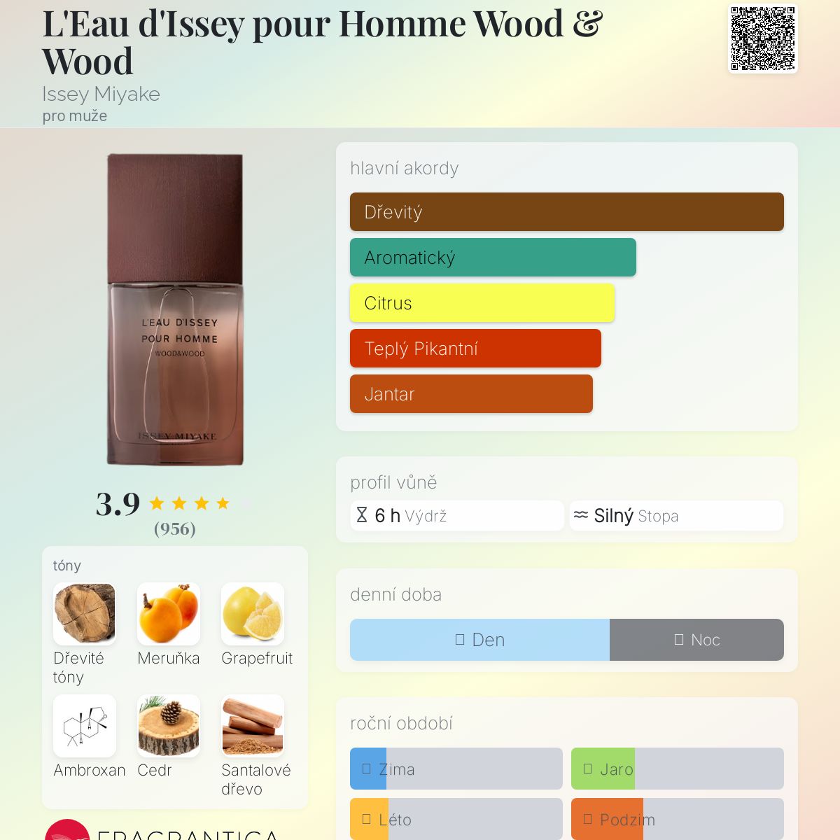 L'Eau d'Issey pour Homme Wood & Wood podle Issey Miyake je Woody vůně pro muže. L'Eau d'Issey pour Homme Wood & Wood byl/a uveden/a v roce 2019. Vrchní tóny jsou Grapefruit, Elimi a Kardamom; střední tóny jsouMeruňka, Ambroxan, Virginský cedr a Santalové dřevo ; základní tóny jsou Dřevité tóny, Haitský vetiver a Pačuli.