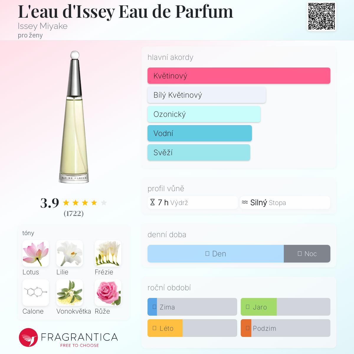 L'eau d'Issey Eau de Parfum podle Issey Miyake je Floral Aquatic vůně pro ženy. L'eau d'Issey Eau de Parfum byl/a uveden/a v roce 2006. Vrchní tóny jsou Lotus, Frézie, Calone a Růže; střední tóny jsouLilie a Vonokvětka ; základní tóny jsou Ambrette (přírodní pižmo), Virginský cedr a Santalové dřevo.