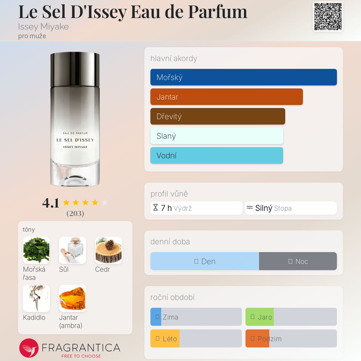 Le Sel D'Issey Eau de Parfum podle Issey Miyake je Aromatic Aquatic vůně pro muže. Toto je nová vůně. Le Sel D'Issey Eau de Parfum byl/a uveden/a v roce 2025. Vrchní tóny jsou Mořská řasa a Sůl; střední tón jeKadidlo ; základní tóny jsou Cedr a Jantar (ambra).