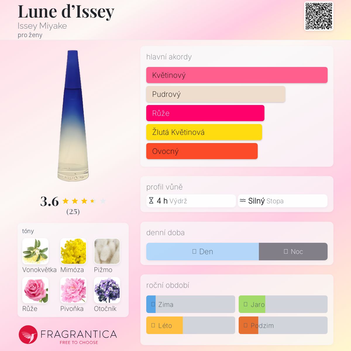 Lune d’Issey podle Issey Miyake je Floral vůně pro ženy. Lune d’Issey byl/a uveden/a v roce 2001. Vrchní tóny jsou Mimóza, Růže a Badyán; střední tóny jsouVonokvětka a Pivoňka ; základní tóny jsou Pižmo a Otočník.