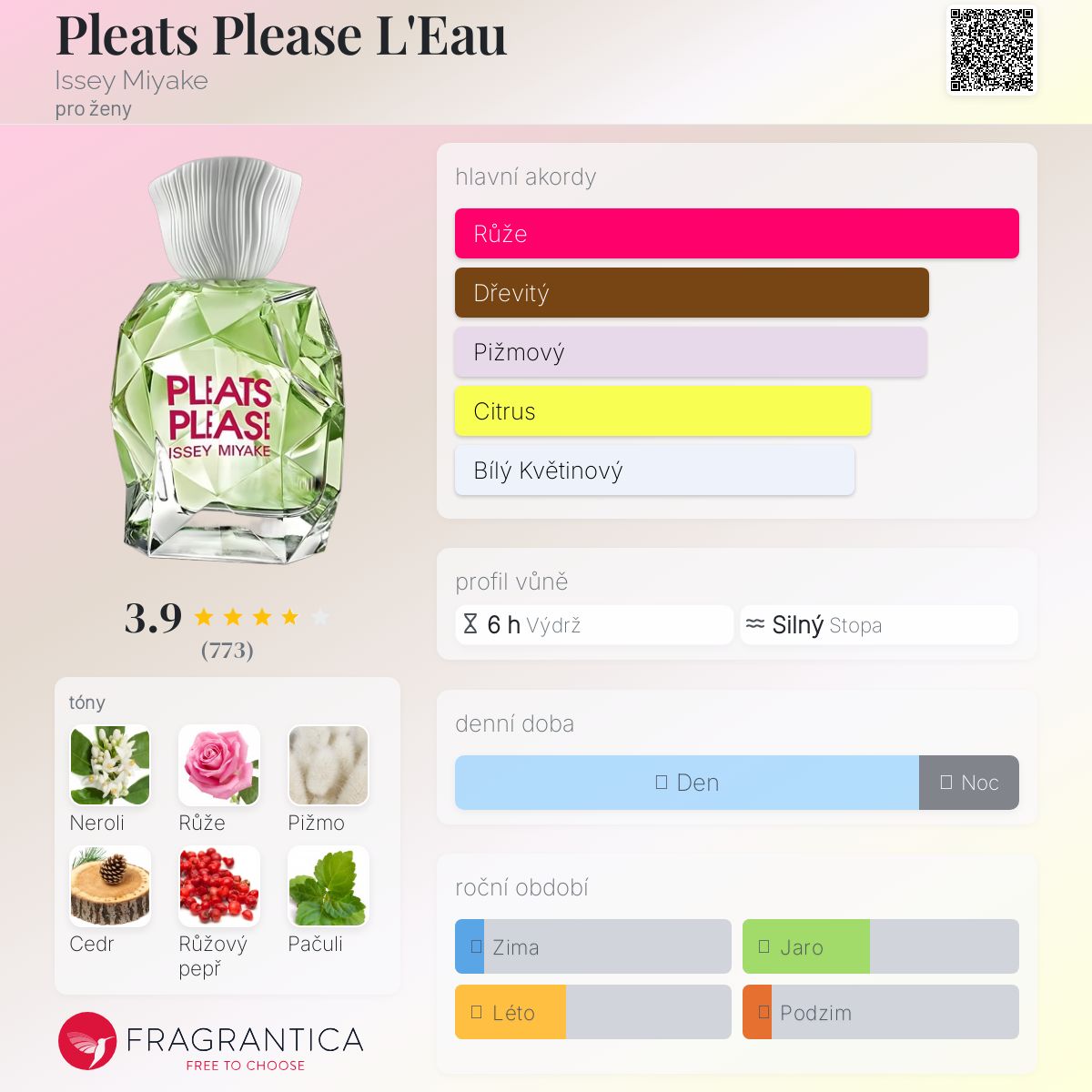 Pleats Please L'Eau podle Issey Miyake je Floral Woody Musk vůně pro ženy. Pleats Please L'Eau byl/a uveden/a v roce 2013. "Nosem" za touto vůní je Aurélien Guichard. Vrchní tón je Divoká růže ; střední tóny jsouNeroli, Bulharská růže a Růžový pepř ; základní tóny jsou Bílé pižmo, Cedr a Pačuli.
