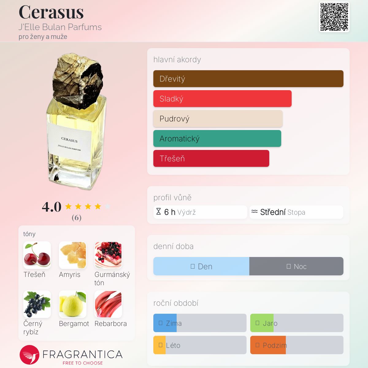 Cerasus podle J'Elle Bulan Parfums je Floral Fruity vůně pro ženy a muže. Toto je nová vůně. Cerasus byl/a uveden/a v roce 2024. "Nosem" za touto vůní je Nathalie Feisthauer. Vrchní tóny jsou Černý rybíz, Bergamot, Rebarbora a Hruška; střední tóny jsouTřešeň, Amyris, Konvalinka, Santalové dřevo, Otočník, Cedr, Vetiver, Orris, Semena mrkve a Pomerančový květ ; základní tóny jsou Gurmánský tón, Kašmírové dřevo, Amber Xtreme, Dřevité tóny, Pačuli, Ambrette (přírodní pižmo), Vanilka a Pižmo.