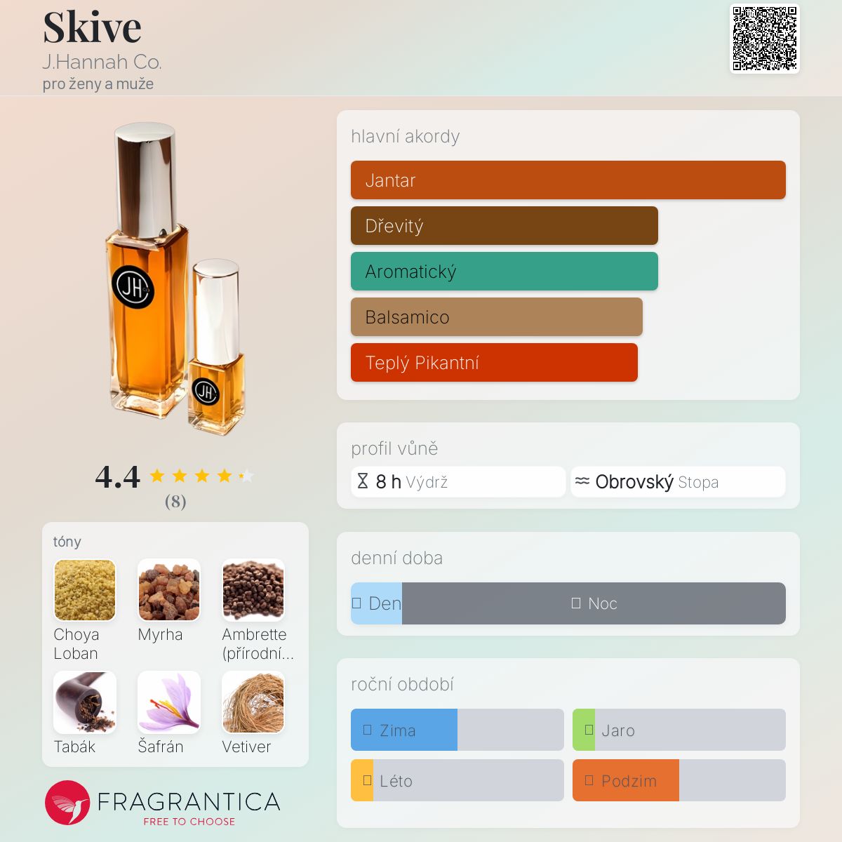 Skive podle J.Hannah Co. je Aromatic Spicy vůně pro ženy a muže. Skive byl/a uveden/a v roce 2014. "Nosem" za touto vůní je Jessica Hannah.