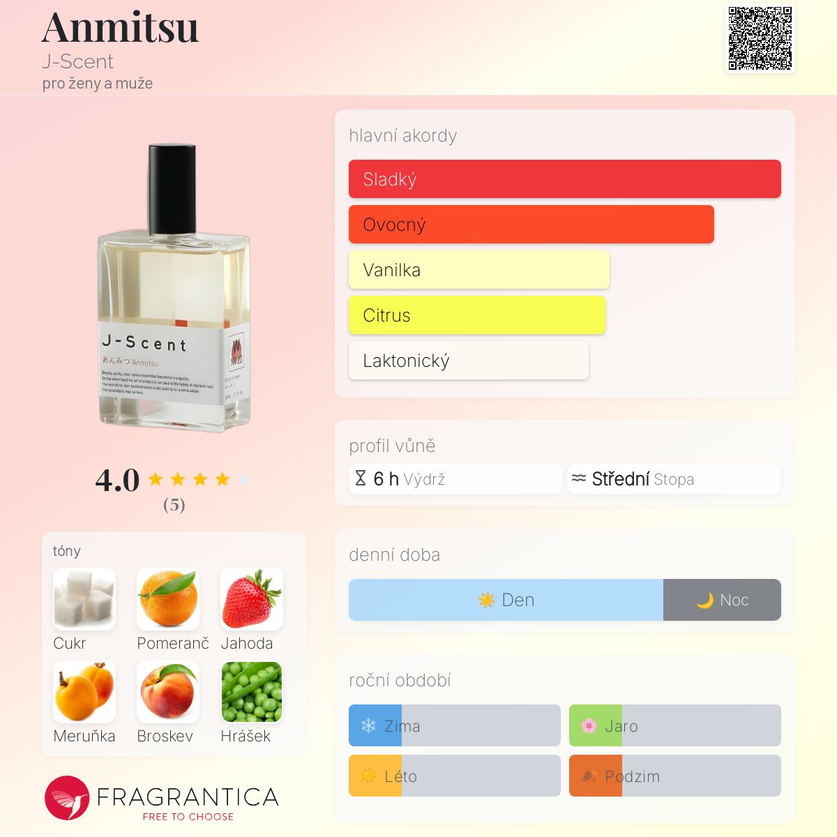 Anmitsu podle J-Scent je vůně pro ženy a muže. Anmitsu byl/a uveden/a v roce 2023. Vrchní tóny jsou Cukr a Pomeranč; střední tóny jsouJahoda, Meruňka a Broskev ; základní tóny jsou Hrášek a Šlehačka.