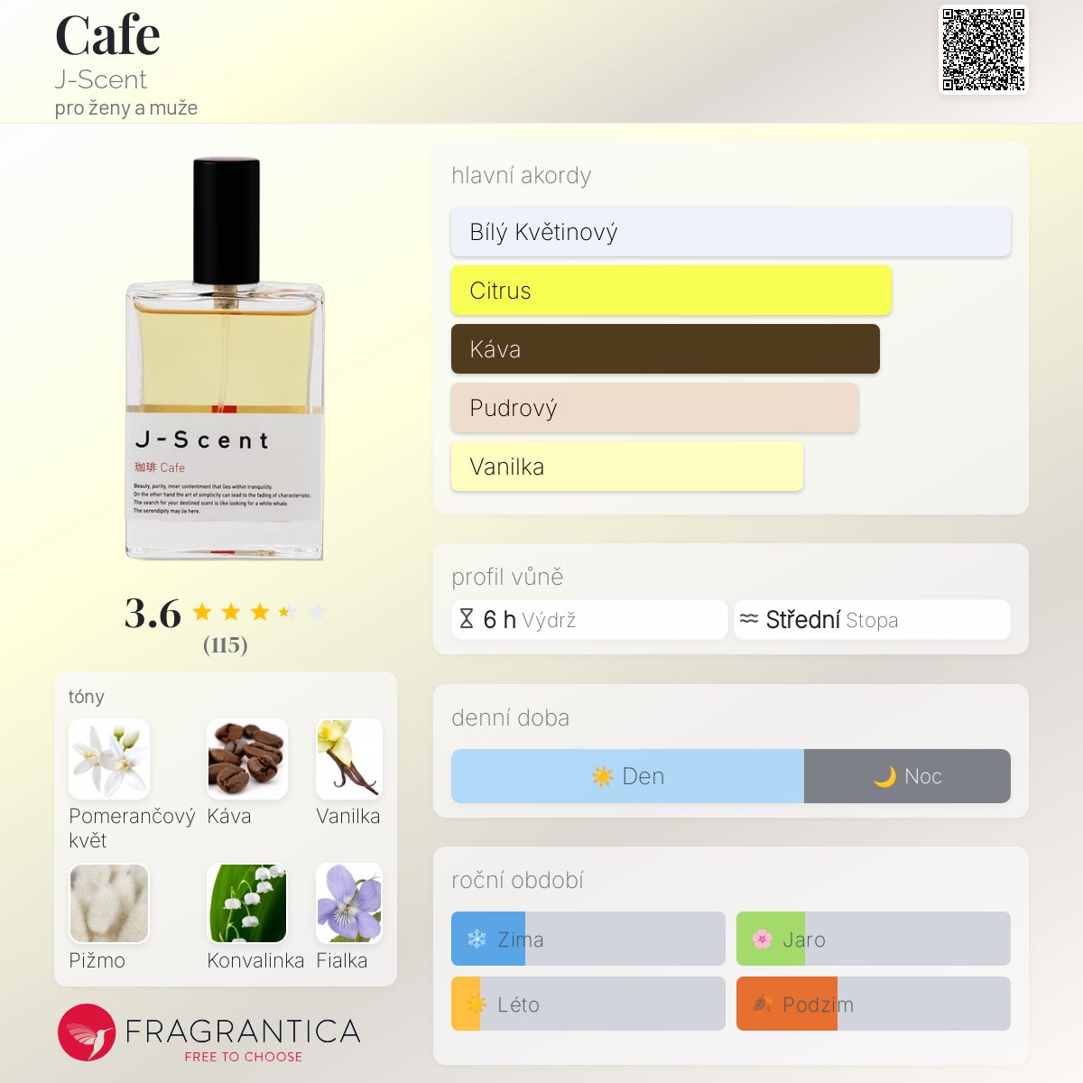 Cafe podle J-Scent je vůně pro ženy a muže. Cafe byl/a uveden/a v roce 2022. Vrchní tóny jsou Káva, Pomeranč a Citrón; střední tóny jsouPomerančový květ, Konvalinka a Fialka ; základní tóny jsou Pižmo, Vanilka a Cedr.