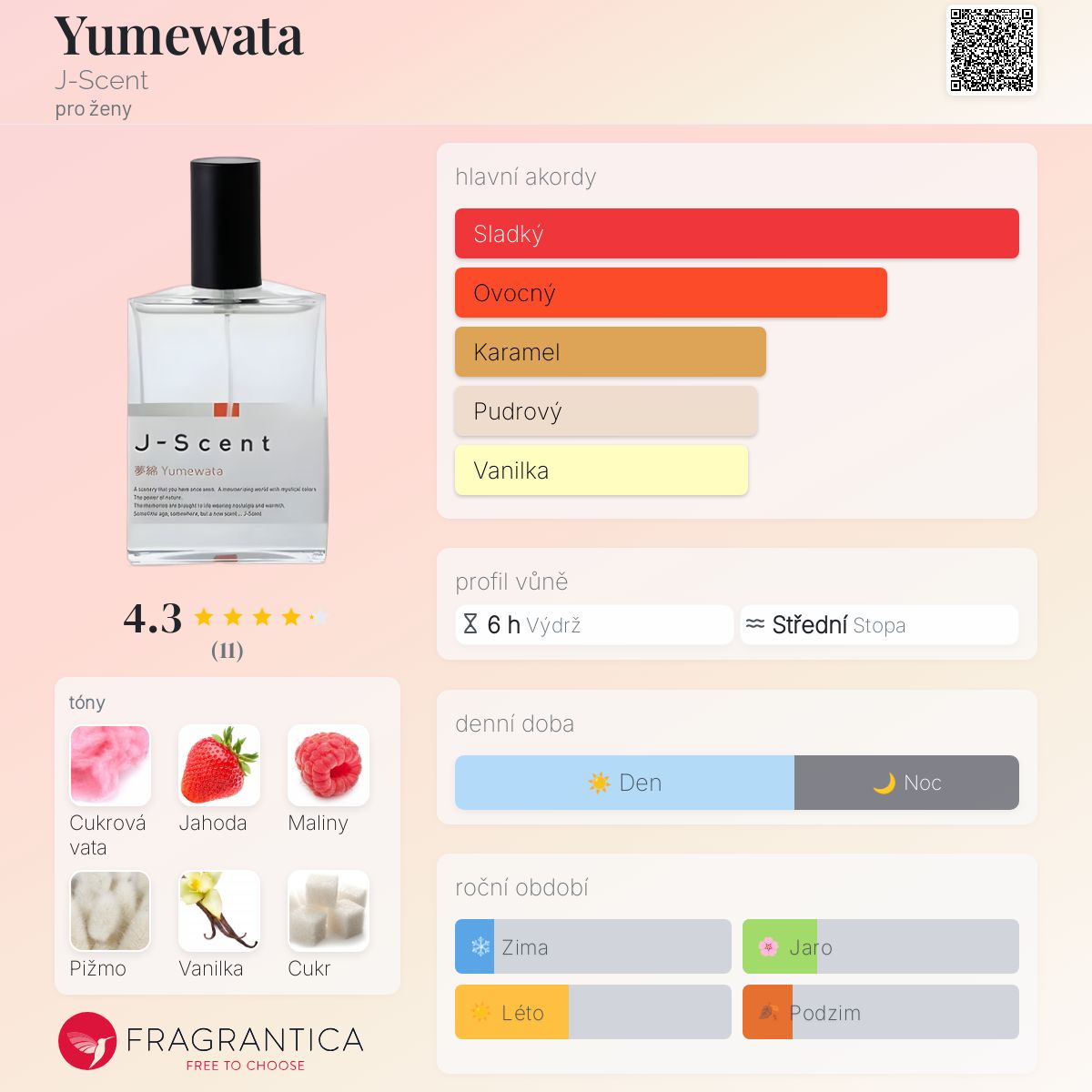 Yumewata podle J-Scent je vůně pro ženy. Toto je nová vůně. Yumewata byl/a uveden/a v roce 2024. Vrchní tóny jsou Jahoda a Maliny; střední tóny jsouCukrová vata a Vanilka ; základní tóny jsou Bílé pižmo a Cukr.