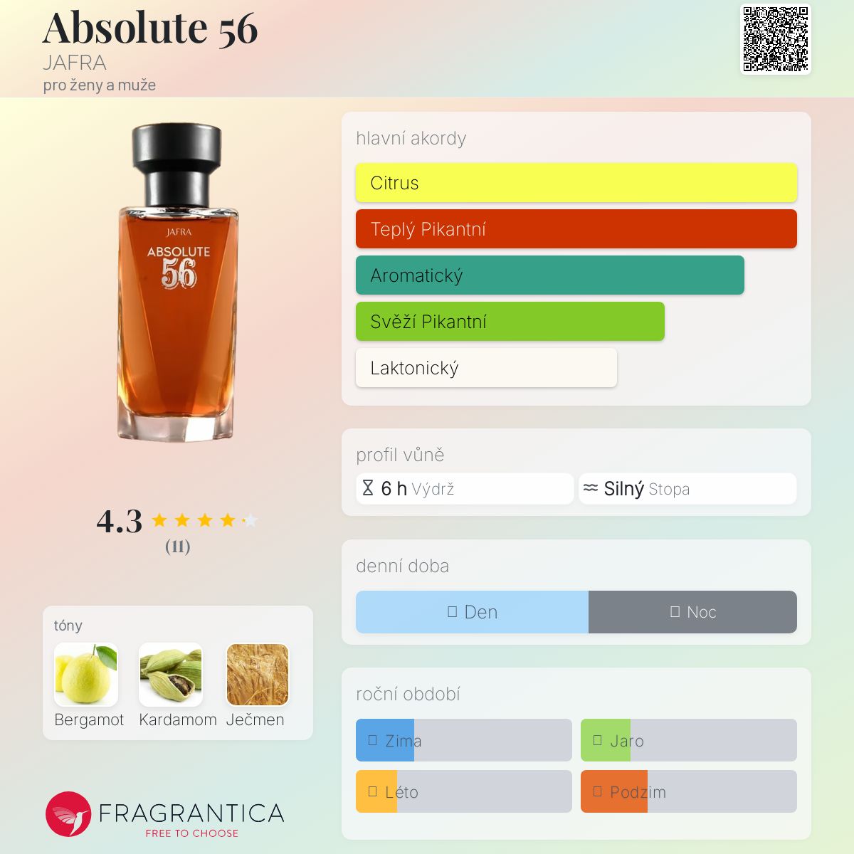 Absolute 56 podle JAFRA je Aromatic vůně pro ženy a muže. Absolute 56 byl/a uveden/a v roce 2020. Vrchní tón je Bergamot ; střední tón jeKardamom ; základní tón je Ječmen.