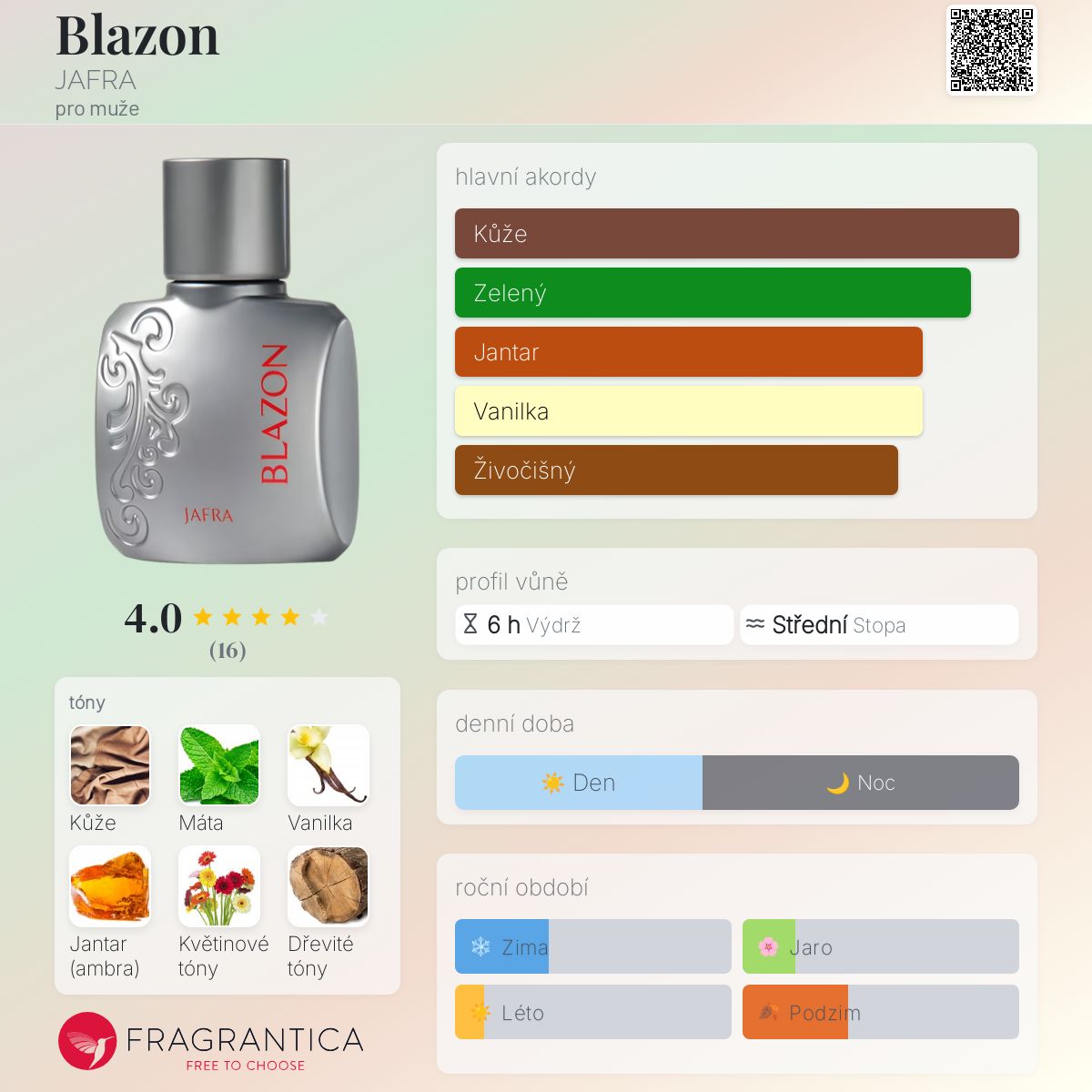 Blazon podle JAFRA je Orientální vůně pro muže. Vrchní tón je Máta ; střední tón jeKvětinové tóny ; základní tóny jsou Kůže, Vanilka, Jantar (ambra) a Dřevité tóny.