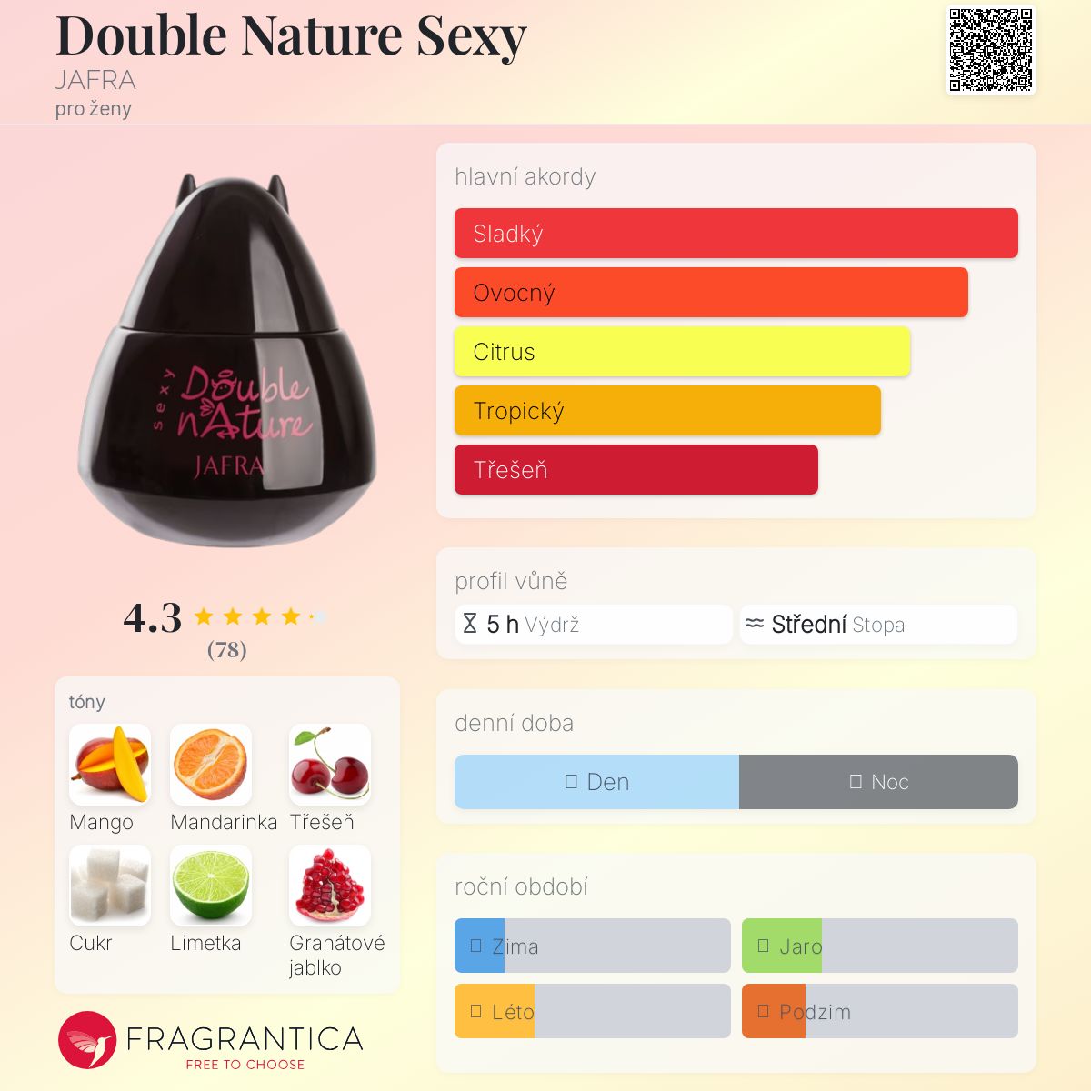 Double Nature Sexy podle JAFRA je vůně pro ženy. Double Nature Sexy byl/a uveden/a v roce 2015. Vrchní tóny jsou Mandarinka, Limetka a Granátové jablko; střední tóny jsouMango, Třešeň a Guava ; základní tóny jsou Cukrová třtina, Pižmo a Vzácné dřevo.