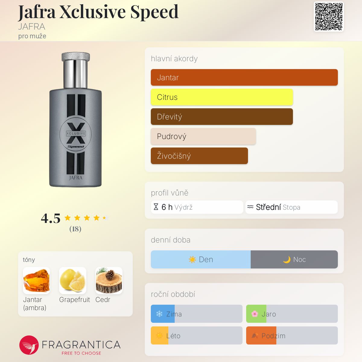 Jafra Xclusive Speed podle JAFRA je Orientální vůně pro muže. Jafra Xclusive Speed byl/a uveden/a v roce 2017. Vrchní tón je Grapefruit ; střední tón jeCedr ; základní tón je Jantar (ambra).