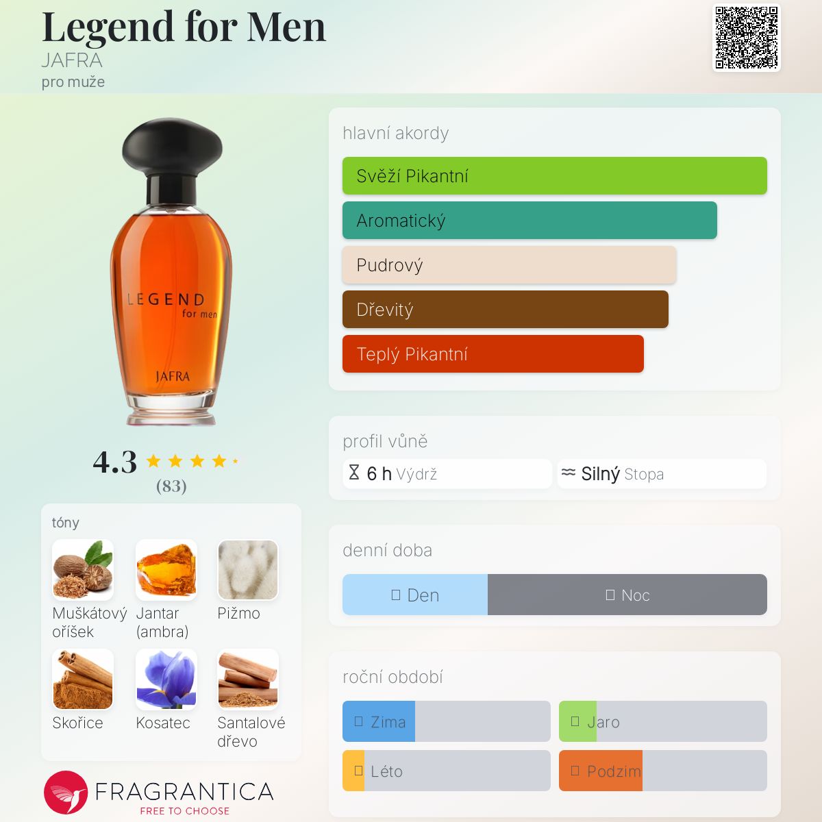 Legend for Men podle JAFRA je Orientální vůně pro muže. Legend for Men byl/a uveden/a v roce 2009. Vrchní tóny jsou Černý rybíz, Bergamot, Broskev a Citrón; střední tóny jsouMuškátový oříšek, Skořice, Kosatec, Bazalka, Šalvěj, Pelargónie, Pepř a Jasmín ; základní tóny jsou Jantar (ambra), Pižmo, Santalové dřevo, Pačuli, Vanilka a Vetiver.