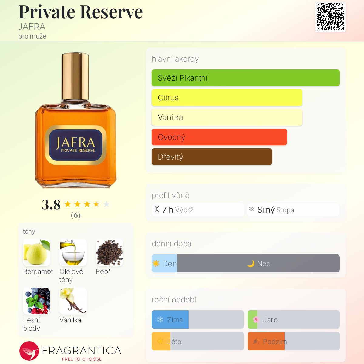 Private Reserve podle JAFRA je Orientální vůně pro muže. Private Reserve byl/a uveden/a v roce 2018. Vrchní tón je Bergamot ; střední tóny jsouOlejové tóny a Pepř ; základní tóny jsou Lesní plody a Vanilka.