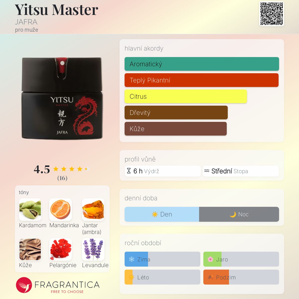 Yitsu Master podle JAFRA je Woody Aromatic vůně pro muže. Yitsu Master byl/a uveden/a v roce 2020. Vrchní tóny jsou Kardamom, Mandarinka a Pamplewood; střední tóny jsouJantar (ambra), Pelargónie a Levandule ; základní tóny jsou Kůže, Vetiver, Pačuli a Dřevo akigala.