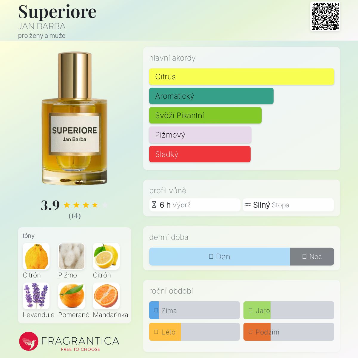 Superiore podle JAN BARBA je Citrus Aromatic vůně pro ženy a muže. Superiore byl/a uveden/a v roce 2018. "Nosem" za touto vůní je Bartosz Puzio. Vrchní tóny jsou Citrón, Citrón, Pomeranč a Bergamot; střední tóny jsouLevandule, Mandarinka, Rozmarýn, Tymián, Máta a Citronový balzám ; základní tóny jsou Pižmo, Balzám Tolu, Myrha a Ambrox Super.